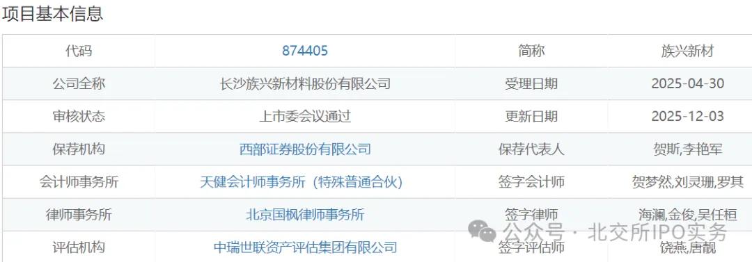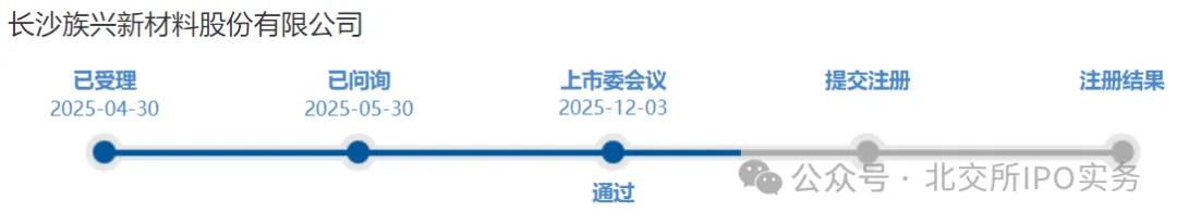 12月3日,长沙族兴新材料股份有限公司(874405)IPO申请获得北交所上市委审核通过。